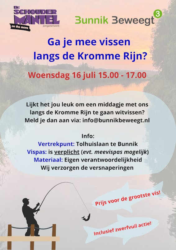 In samenwerking met Jongerenwerk Schoudermantel gaan wij witvissen aan de Kromme Rijn in Bunnik. De activiteit is in principe voor de jeugd, maar ouders zijn uiteraard ook welkom. Mocht je geen ouder zijn, maar wel vissen heel leuk vinden dan kun je uiteraard altijd komen helpen. Wees welkom! Interesse of vragen? Stuur even een mailtje naar: