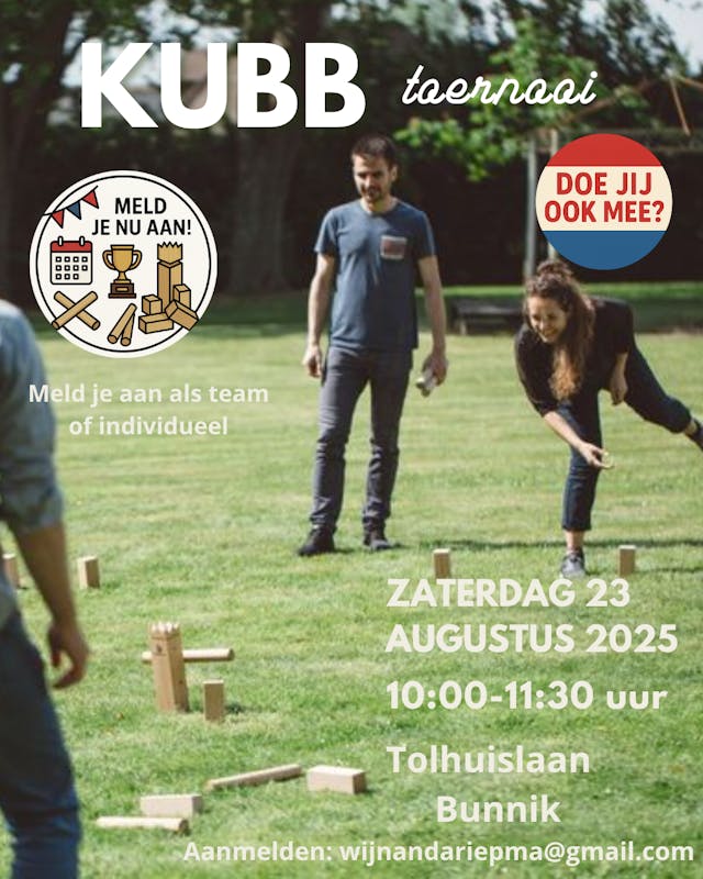 Heb jij zin in een gezellige en sportieve ochtend? Meld je dan nu aan voor dit kubb toernooi in Bunnik op Zaterdag 23 augustus om 10:00 tot 11:30 uur.