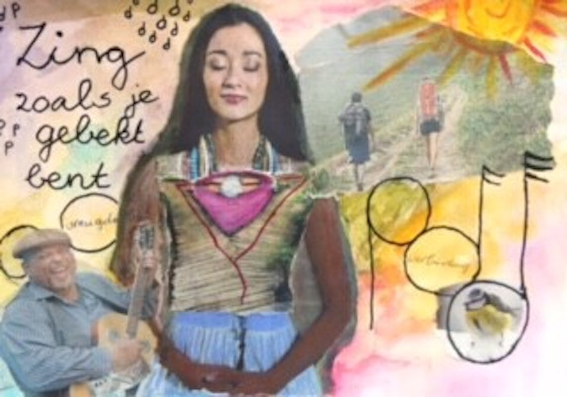 Het thema is ‘Zing zoals je gebekt bent’. Dit is precies wat een helende collage doet. Hij laat jou weer je eigen lied zingen. In bovenstaande collage heb ik alle elementen die belangrijk zijn in een helende collage afgebeeld. Je kijkt naar binnen, je ervaart het positieve in jezelf en soms het moeilijke (de berg oplopen met een rugzak) dat aan transformatie toe is (de zon rechtsboven). Door dit alles aandacht te geven ontstaat vreugde. In deze workshop staan jouw kwaliteiten centraal. Je kiest één van deze kwaliteiten uit en die ga je aan je papier toevertrouwen. Door de collage laag voor laag op te bouwen ontdek je meer over deze unieke kwaliteit. Onbewuste en bewuste facetten verbinden zich in je hart met elkaar. Zingend en lachend (zoals de man met de gitaar) ga je met jouw collage en nieuwe perspectieven naar huis. Als je thuis jouw collage op een zichtbare plaats neerzet, dan ontvouwen zich mogelijk nog meer inzichten.