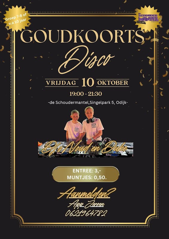 Disco Goudkoorts voor iedereen van groep 7 en 8! Met Dj's Noud en Duke. Trek iets glimmends aan als dat lukt. Entree is 3 euro, consumptiemuntjes 50 cent. Aanmelden graag via Jeroen: 06-21964782