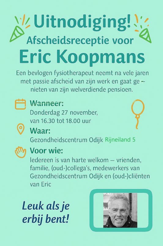 Ben jij ooit door Eric behandeld, heb je met hem samengewerkt of wil je hem gewoon persoonlijk bedanken? Kom dan langs en hef samen met ons het glas op een welverdiend pensioen voor een man die voor velen méér was dan een fysiotherapeut.