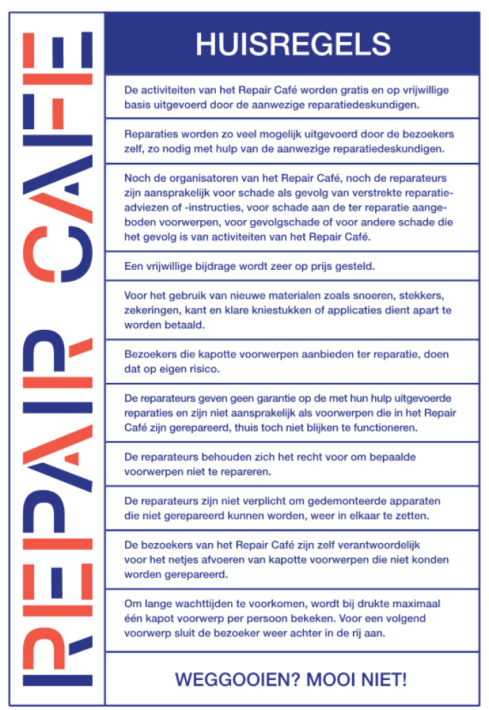 In dit Repair Café kunnen inwoners hun kapotte spullen brengen om dat samen met deskundige vrijwilligers te (laten) repareren. Het gaat daarbij om huishoudelijke apparaten, audio-apparatuur en meubels/houten voorwerpen.